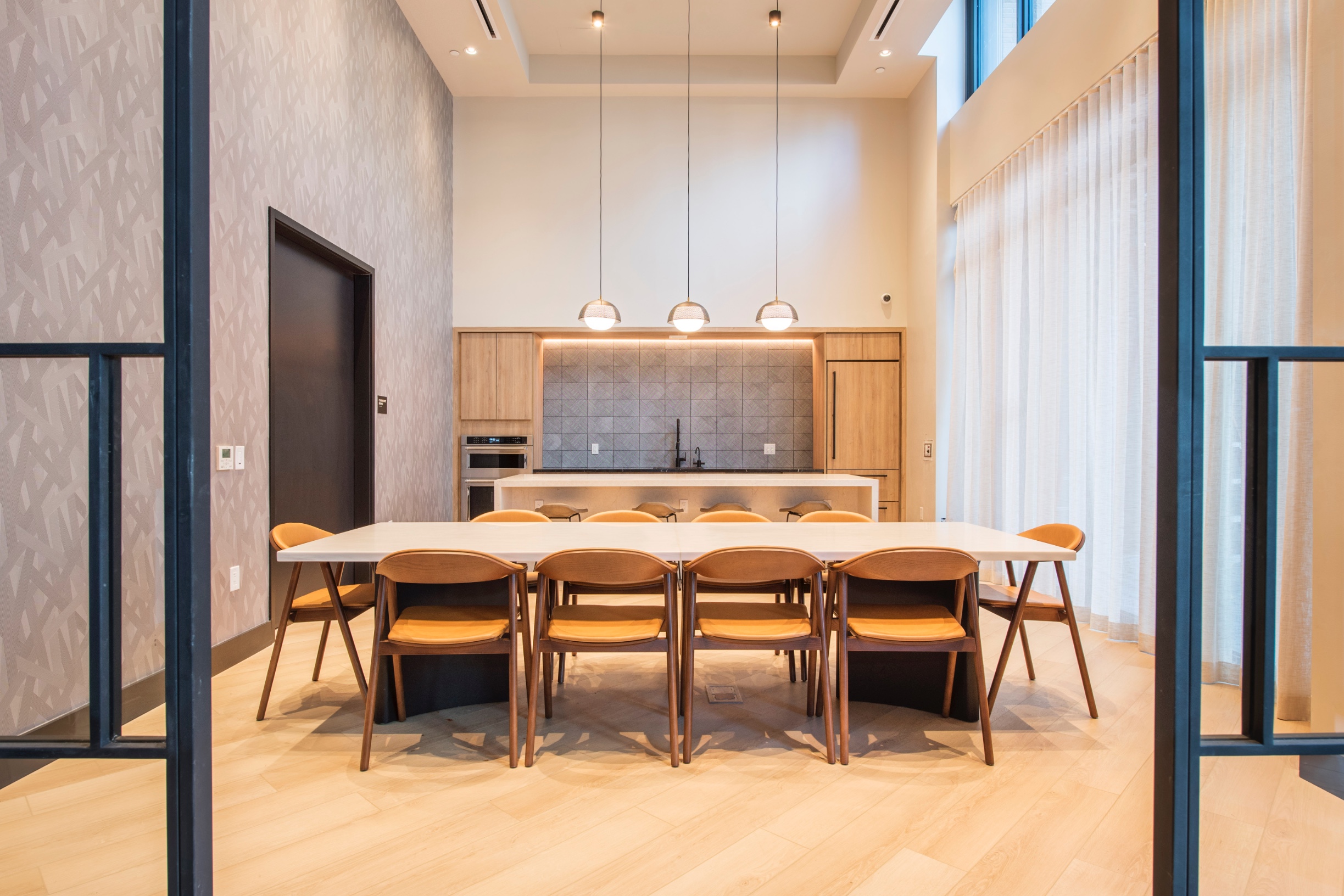 A reservable catering kitchen with a private indoor-outdoor dining room also serves as a co‑working lounge, featuring a large communal work table and private conference rooms—perfect for leading a working session or hosting an indoor-outdoor gathering.